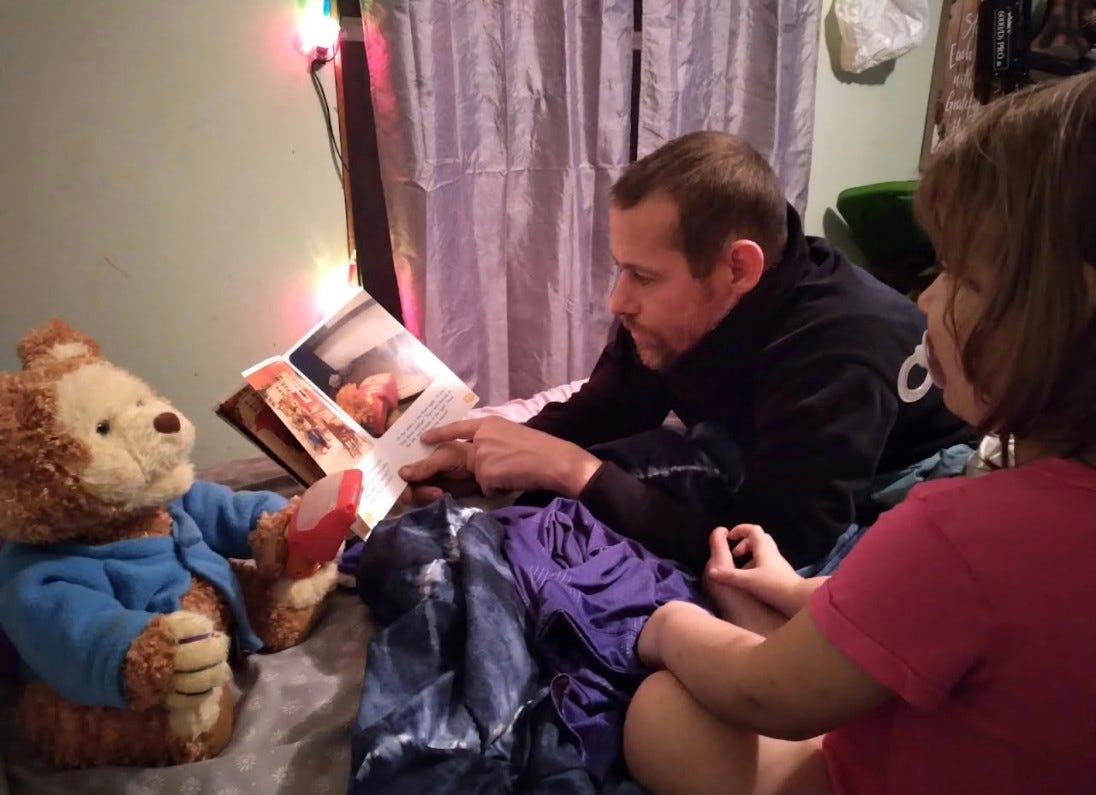 Two family photographs illustrate the lives disrupted by these events. One from 2021 shows Pete reading to his granddaughter.