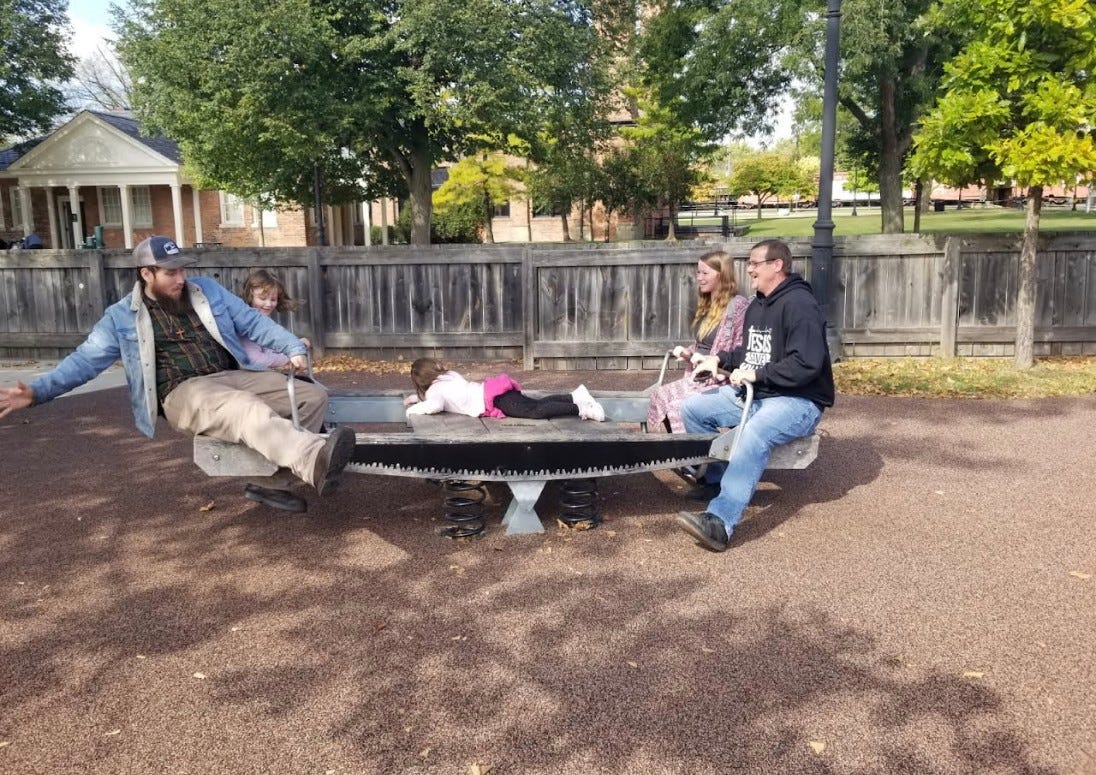 The second image, taken on September 30, 2022, captures what the family describes as their final outing together before the men's incarceration: Pete, Joe, Jada, and the kids enjoying time on a playground seesaw in a local park.